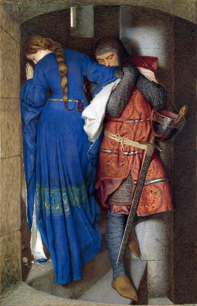Estoy inmersa en encuentros representados en las pinturas. A menudo vuelvo a ojear en la pila de libros y tarjetas de arte, recuerdos de las visitas a museos, iglesias y exposiciones. Una balada medieval danesa cuenta la triste historia del amor prohibido entre la princesa Hellelil y el príncipe Hildebrand. Esto inspiró la pintura El encuentro en las escaleras de la torreta, una acuarela del irlandés F.W. Burton de 1864 (Galería Nacional, Dublín), que captura el adiós final: ambos mueren poco después, él en un duelo y ella de un corazón quebrado. Después de una larga inmersión en este encuentro, me vienen imágenes de seres queridos que se despiden para ir a la guerra en cualquier parte del mundo.